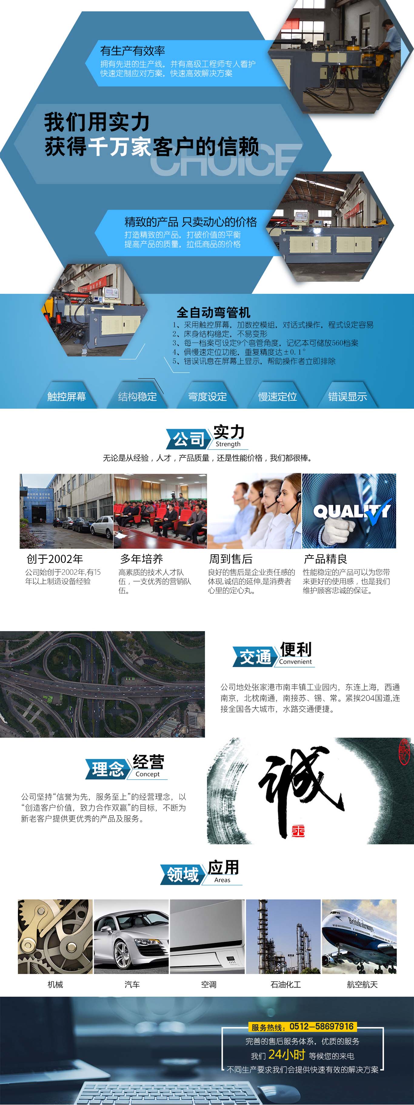 張家港市雙和機械制造有限公司始建于2001年,占地面積12000平方米,南鄰蘇州、無錫、上海,東鄰常州、南京,交通便利,位長三角中間地段,風景優(yōu)美的張家港。 雙和公司至創立開始,引進了國外的設計制造理念,組建了企業生產管理優(yōu)秀團隊,致力于管材加工機械研發(fā)、設計、制造。創新的設計理念,嚴格的質量把關,專業的售后服務,不斷提升了我在整個行業的影響力。 雙和公司生產的系列產品分為彎管機、切管機、縮管機、磨齒機、伺服彎管機、數控彎管機、液壓彎管機、自動切管機、管端成型機、倒角機、大弧滾圓機、鋁切機、壓彎機等管材加工機械,廣泛用于航天業、造船業、汽車制造、鍋爐制造、自行車、摩托車、體育健身器材、管制品家...